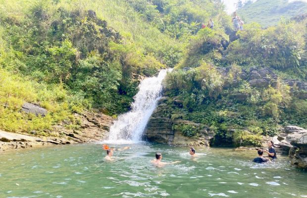 Kids swimming and jumping at Du Gia waterfall.