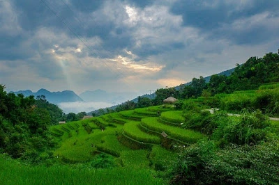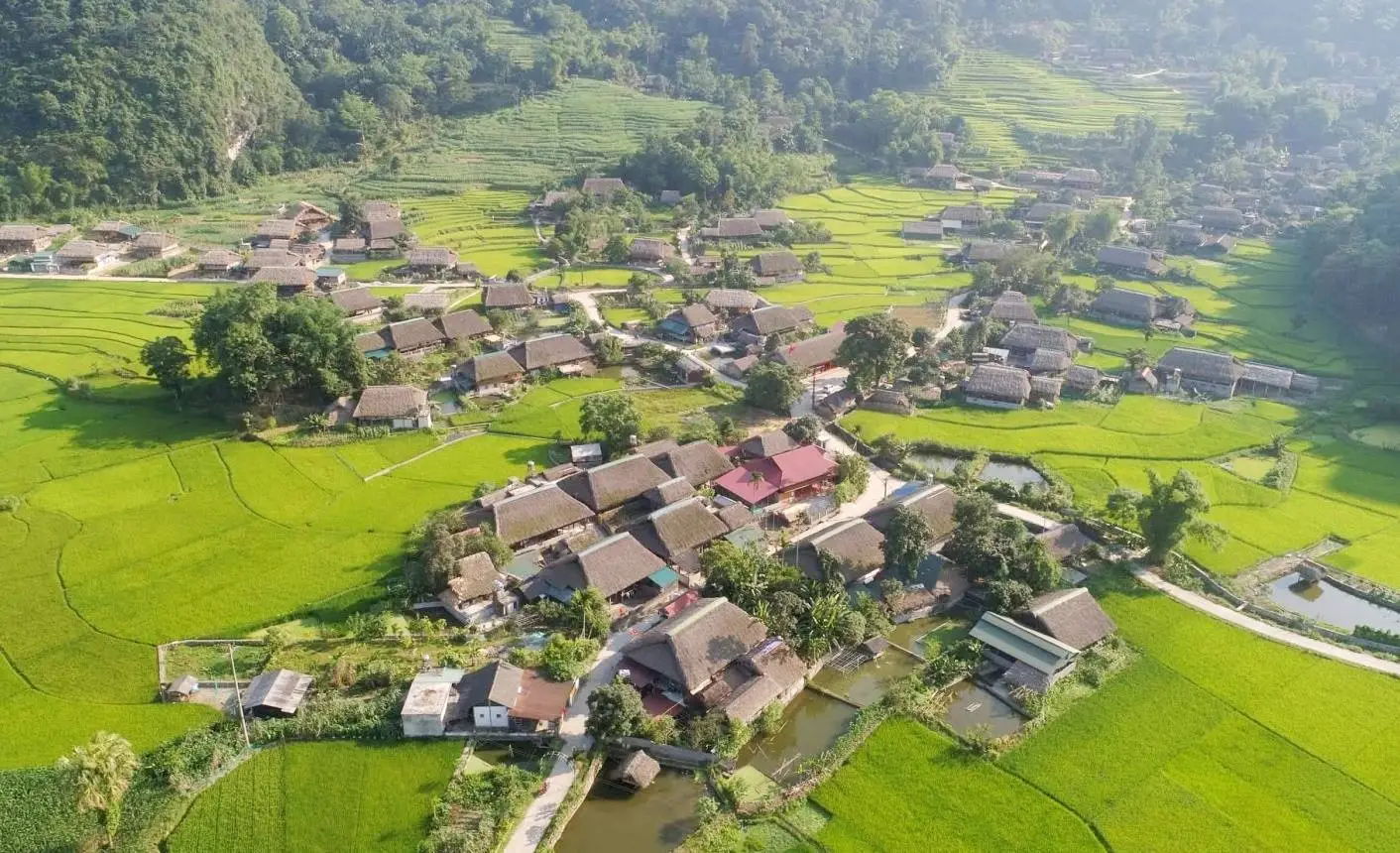 Thon Tha is a small, serene village inhabited entirely by the Tay ethnic group. As you ride into the village, the first thing you notice is the uniformity of the architecture. Unlike other areas where modern bricks are creeping in, Thon Tha remains a sanctuary of traditional stilt houses. These homes are built with wood and bamboo, topped with thick palm-leaf roofs that have weathered decades of mountain mist. The village is surrounded by a natural amphitheater of limestone peaks and terraced fields, making it feel like a world hidden away from the modern bustle of Ha Giang city.